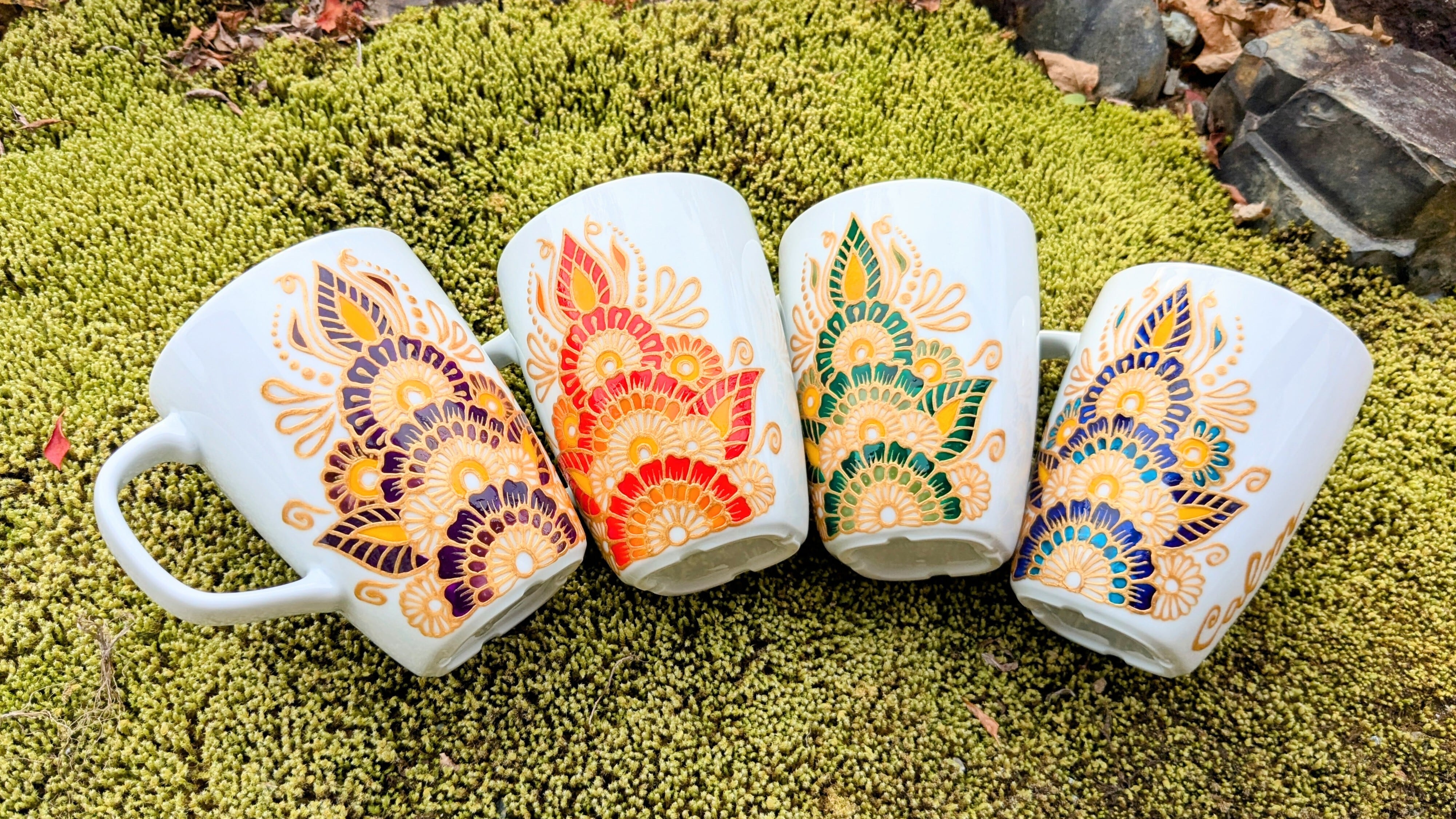 ヘナアートマグカップ マグカップ:ホワイト ペイント:赤、オレンジ、イエロー、ゴールド サイズ:高さ10.5cm 底直径 5cm 上部直径 8cm 重さ:286g 電子レンジ:使用OK 食洗器:使用OK ヘナタトゥーで使われる絞り書きの手法を使い、全て手書きでペイントしております。 絞り書きならではの立体感の触り心地とても良いです。 鮮やかな赤を基調にした花モチーフ。 裏、表絵柄が違うので、どちらの向きも楽しんでいただけます。 APマーク取得の人体に無害で安全な塗料を使用しており、ペイント後は焼き付け作業を行っている為、飲食はもちろん食洗器もOKとなります。 ~ヘナタトゥーとは~ 中近東を中心に古い歴史を持つ伝統装飾文化。 『幸運を呼ぶ』『魔除け』などの願いを込めたおまじないの意味もあります。 ヘナタトゥーで使われるアジアンテイストなデザインは、繊細で華やかなものばかり。 使っていただく方の幸運を願いながら一点一点全て手作業でペイント、仕上げ作業を行っております。 穏やかな日常を華やかに彩るヘナアート作品。 沢山の幸運が訪れますように。 ー配送についてー ・通常ご注文から1日~4日程で発送します。 ・複数点購入の際、送料をまとめますので、ご購入前にメッセージよりご連絡下さい。 ・配達時間に指定がある方は、ご購入の際【備考欄】にご記入ください。 ※記入がない場合は”時間指定なし”で発送します。