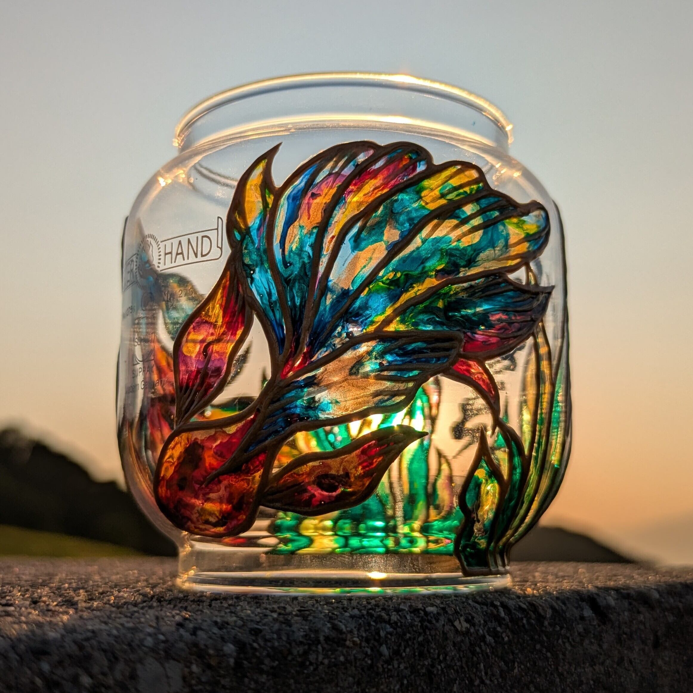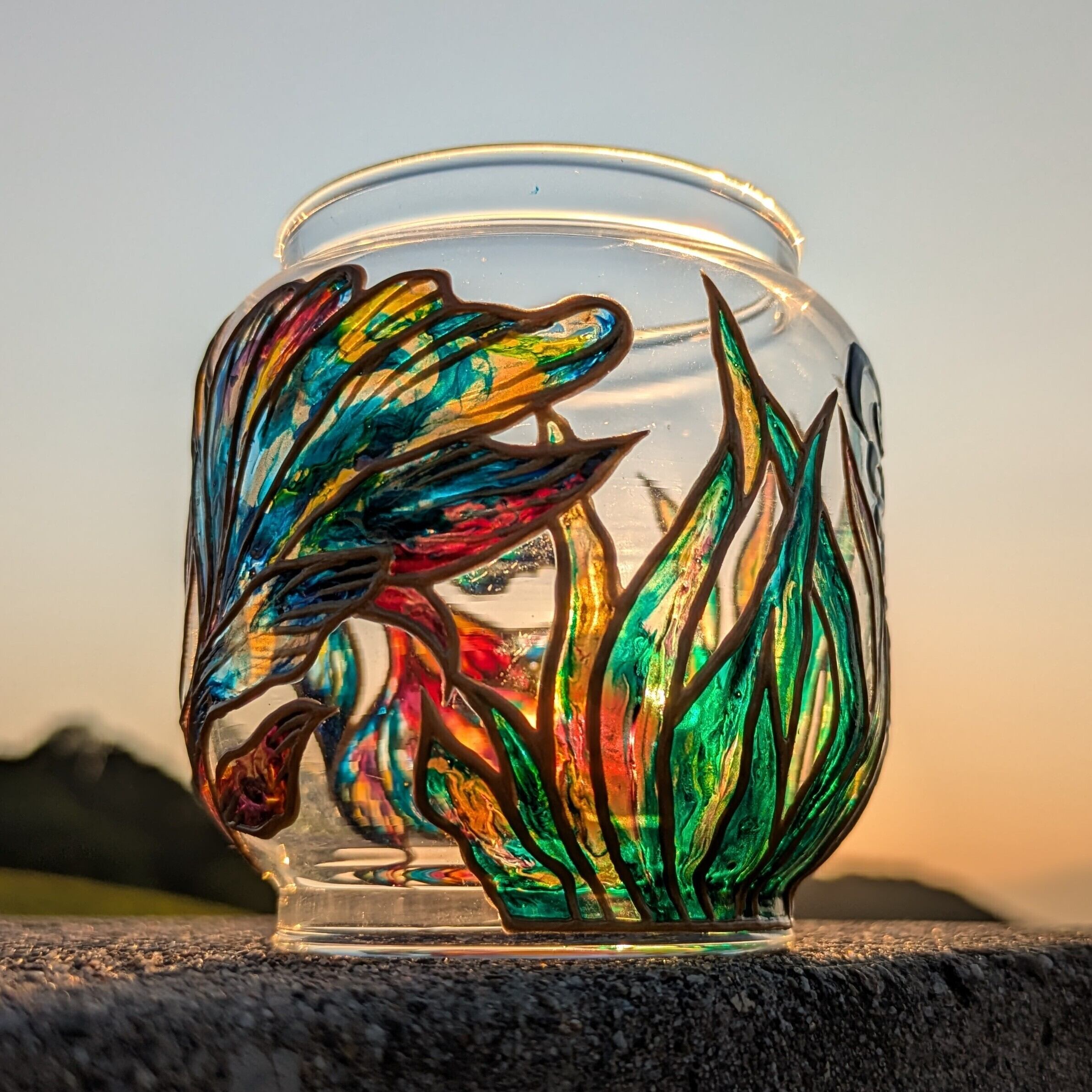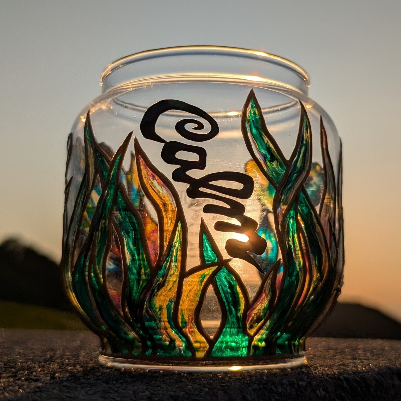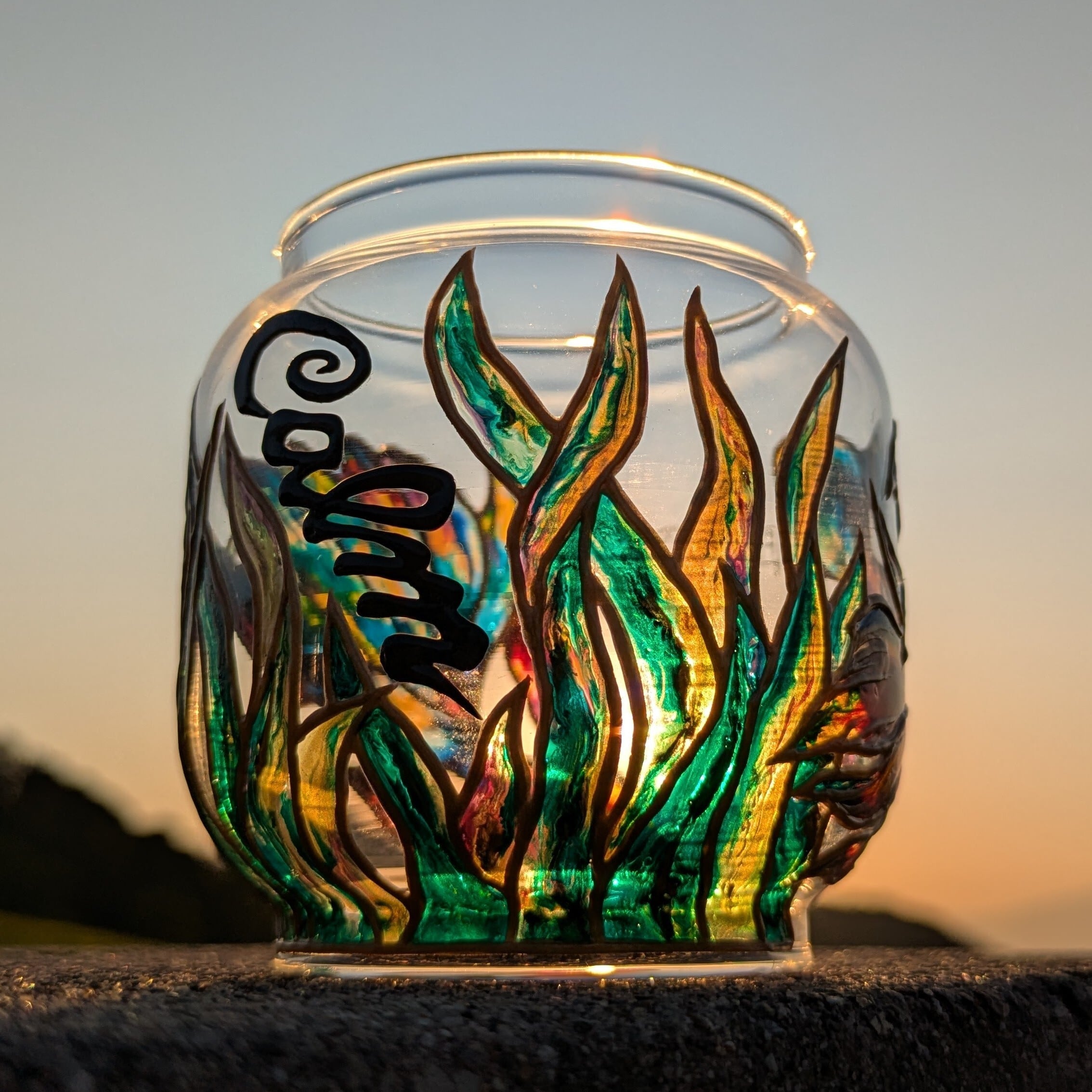 ランタン本来の灯りも楽しんでいただく為に、あえて色を抜いた部分はまるで水のよう。