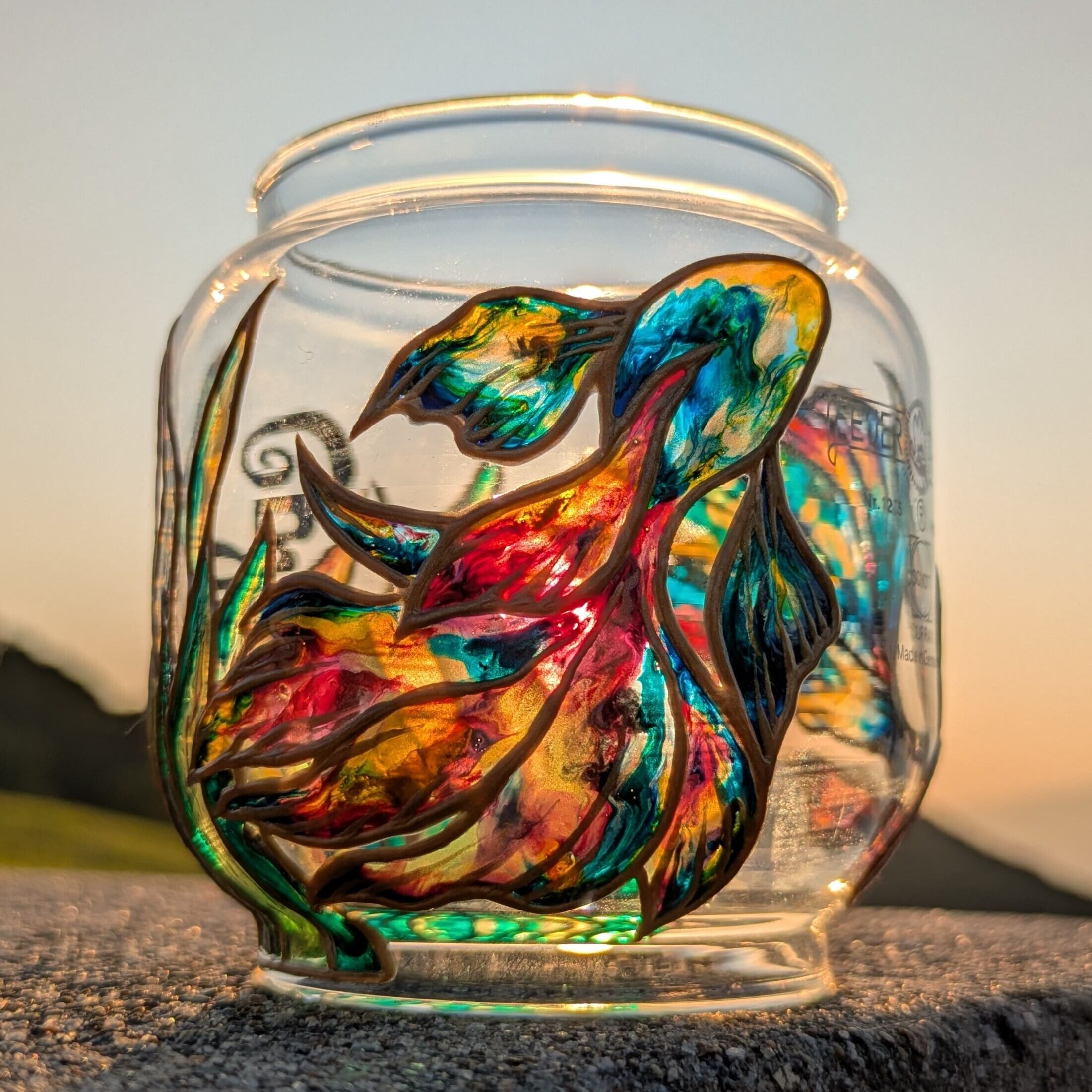 ランタンに火を灯すと、内側から照らされた絵柄が色鮮やかな灯りへと変わります。