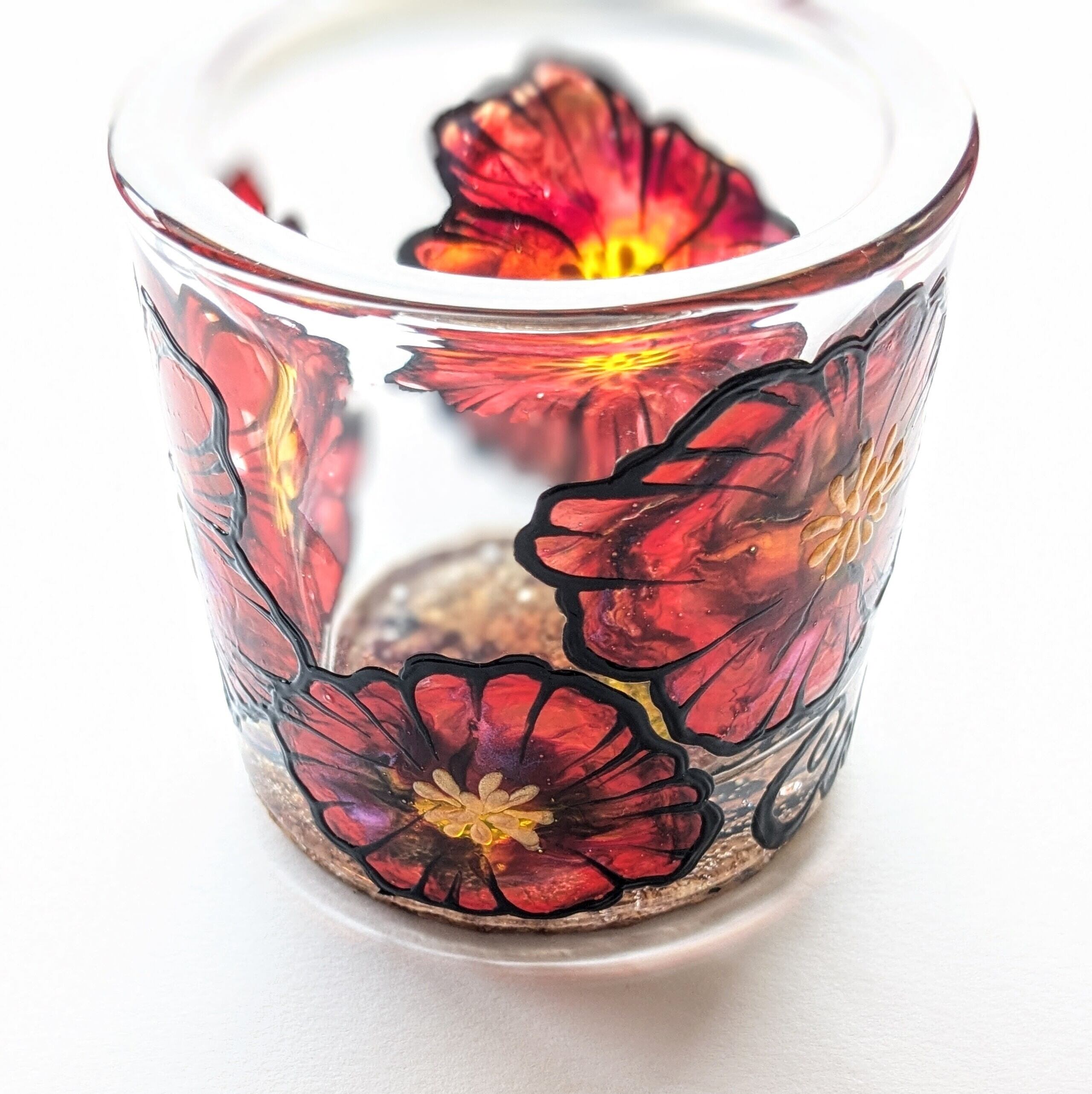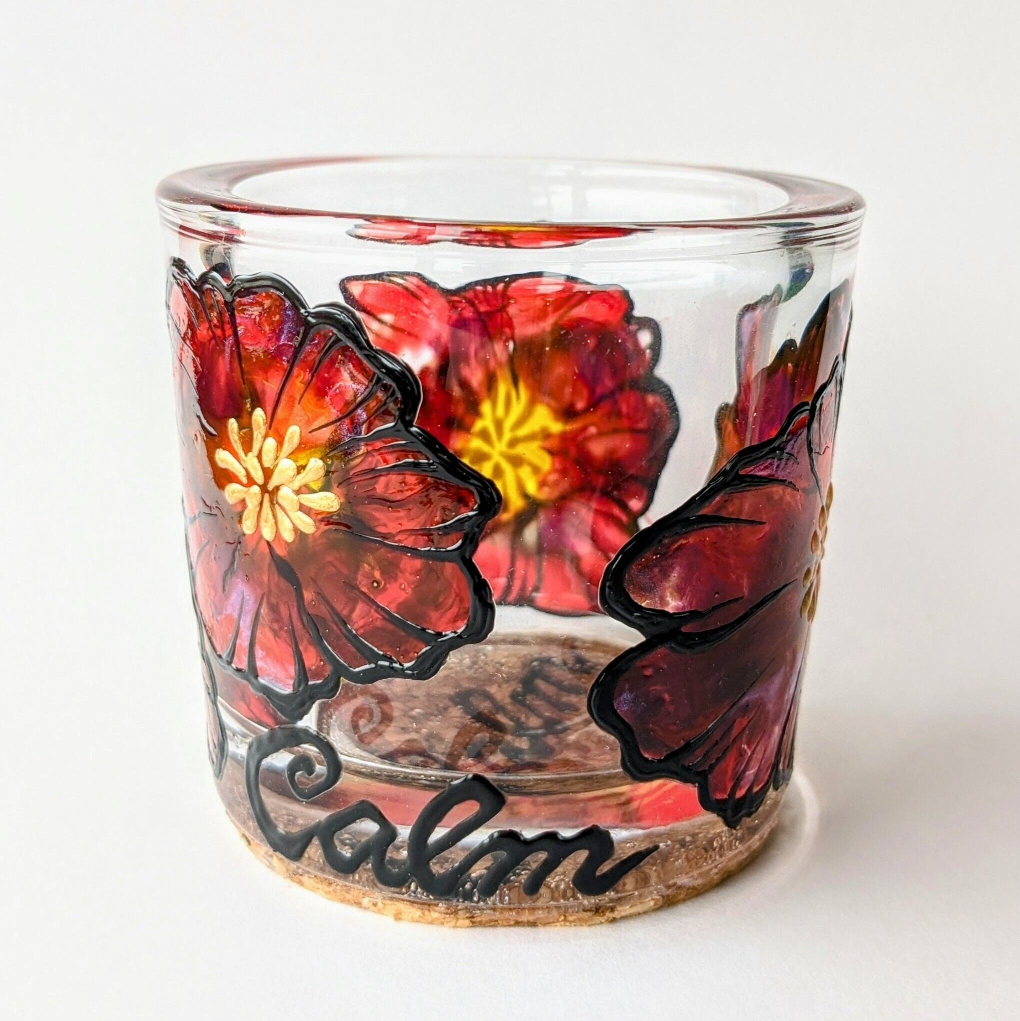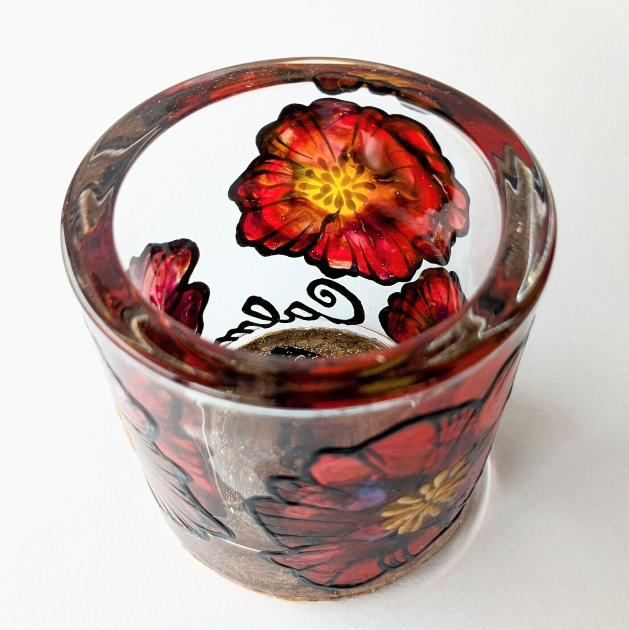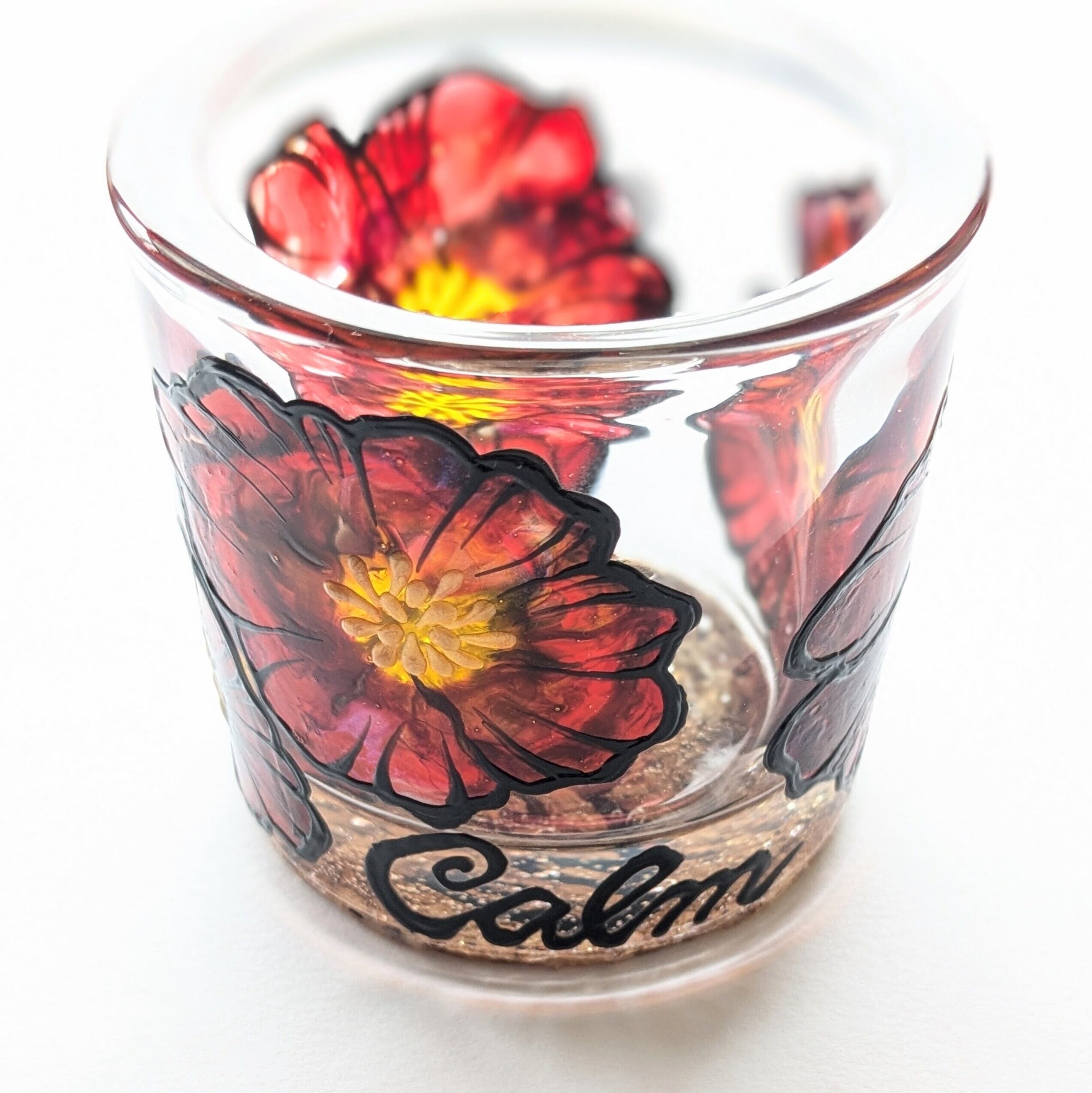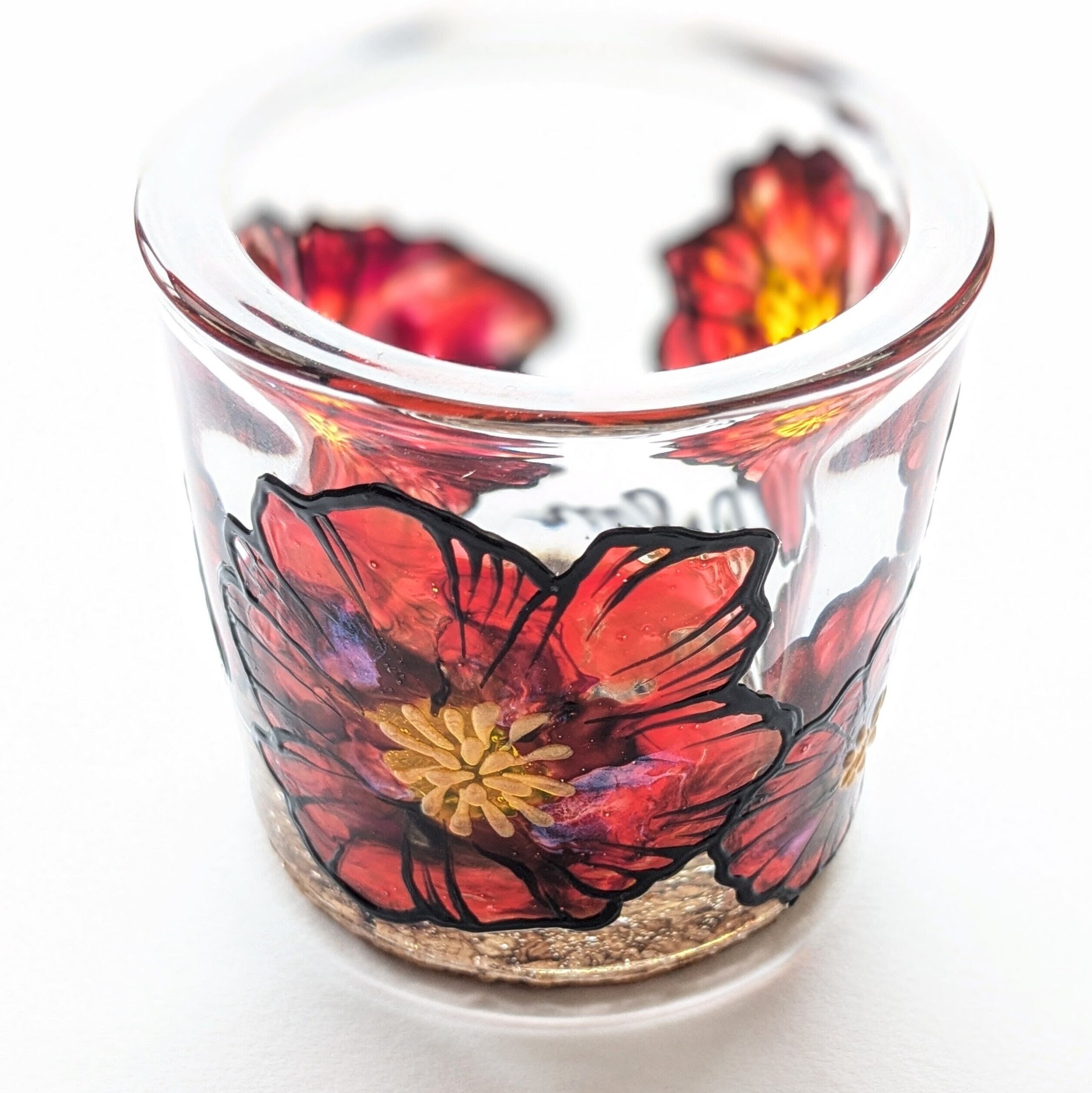 この水中花キャンドルホルダーは、美しいマーブル模様の花が施され、キャンドルを灯すことで幻想的な光を演出します。