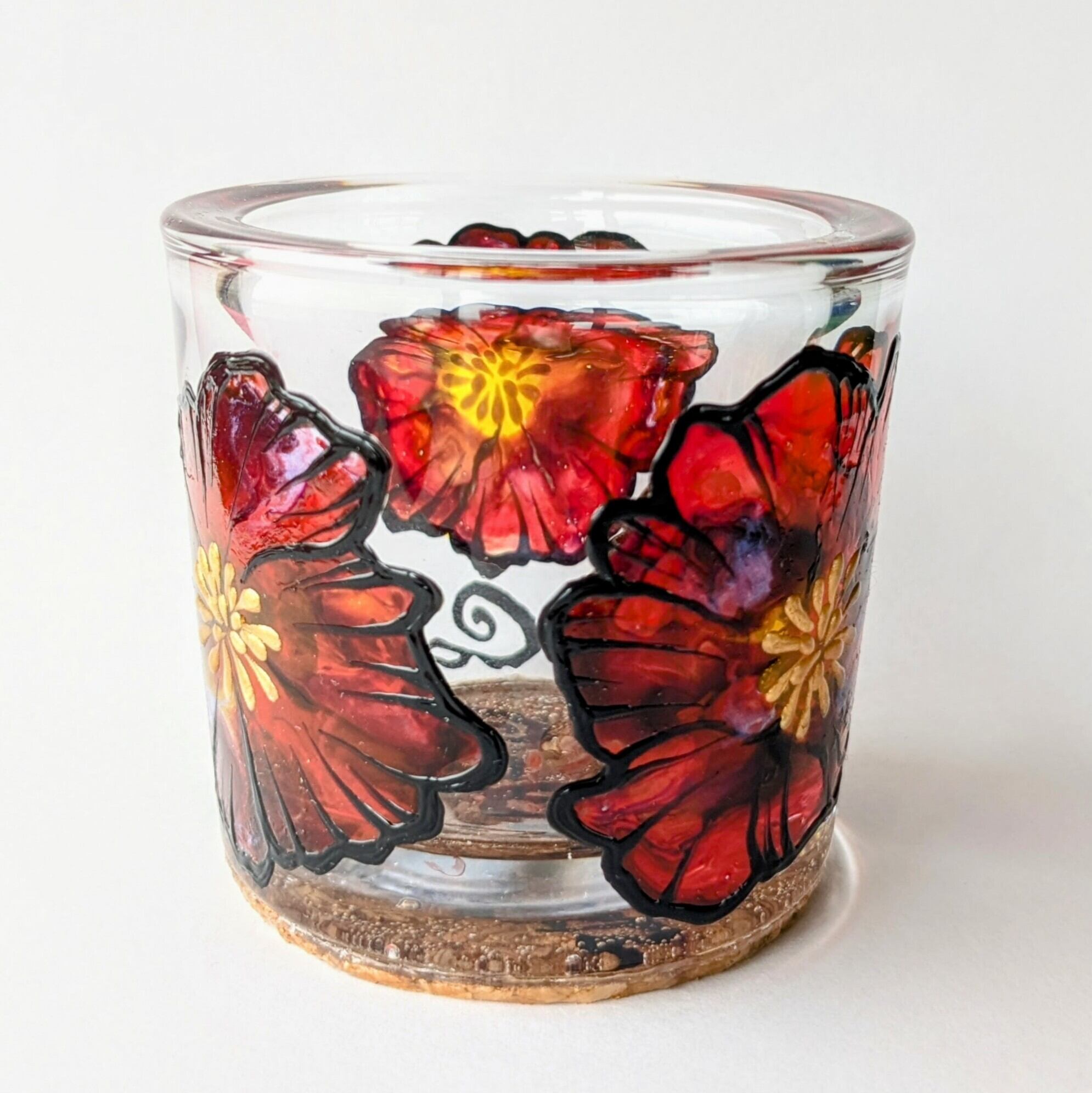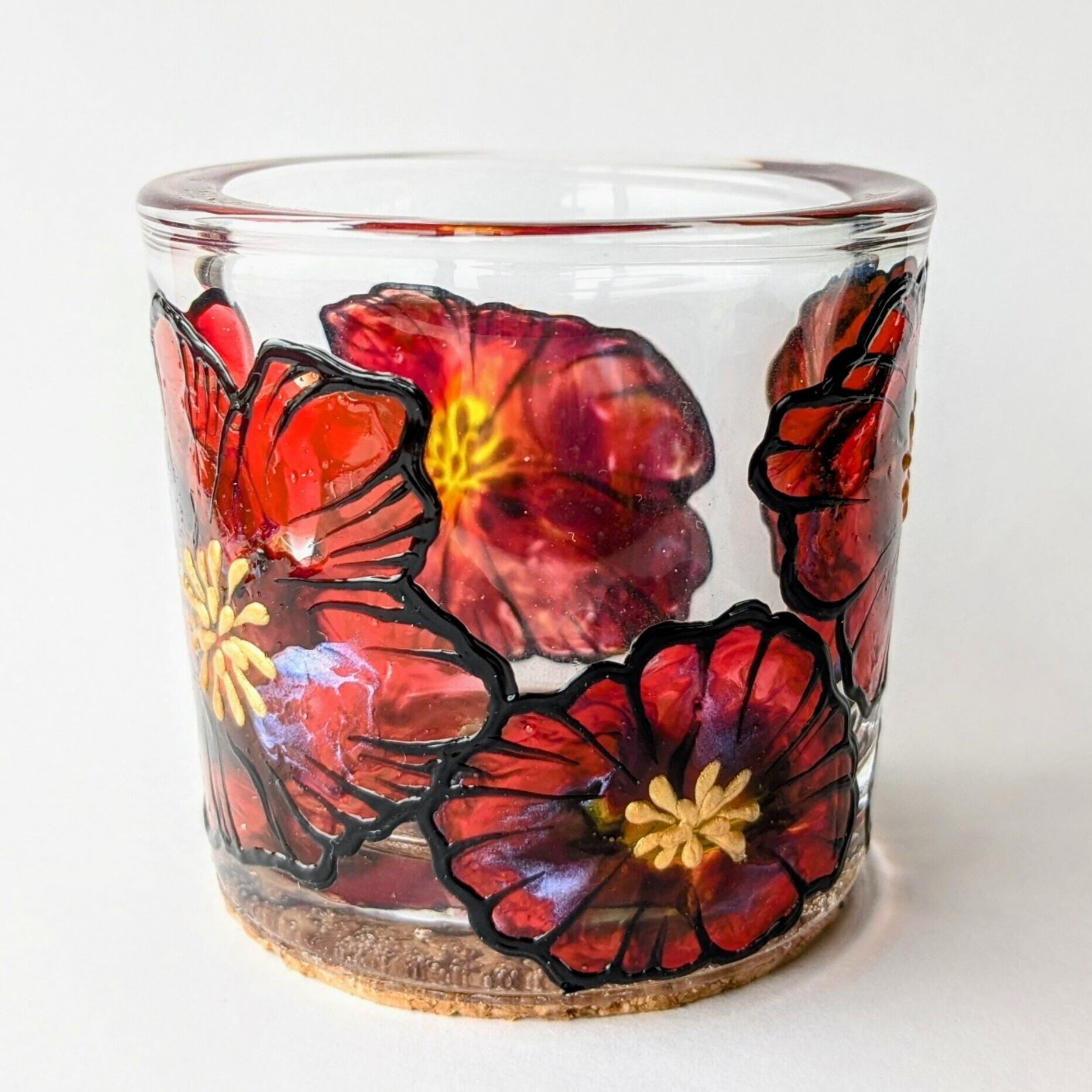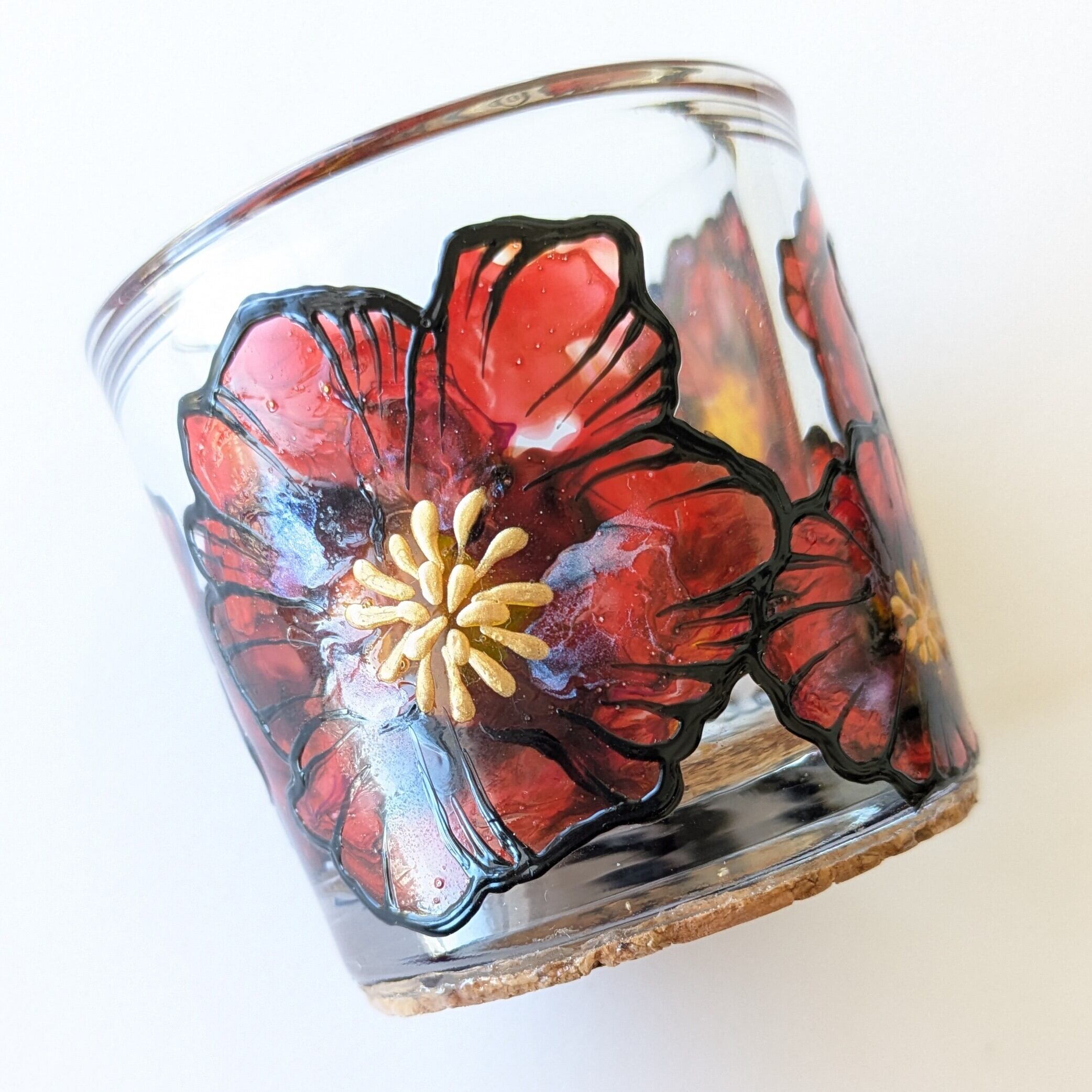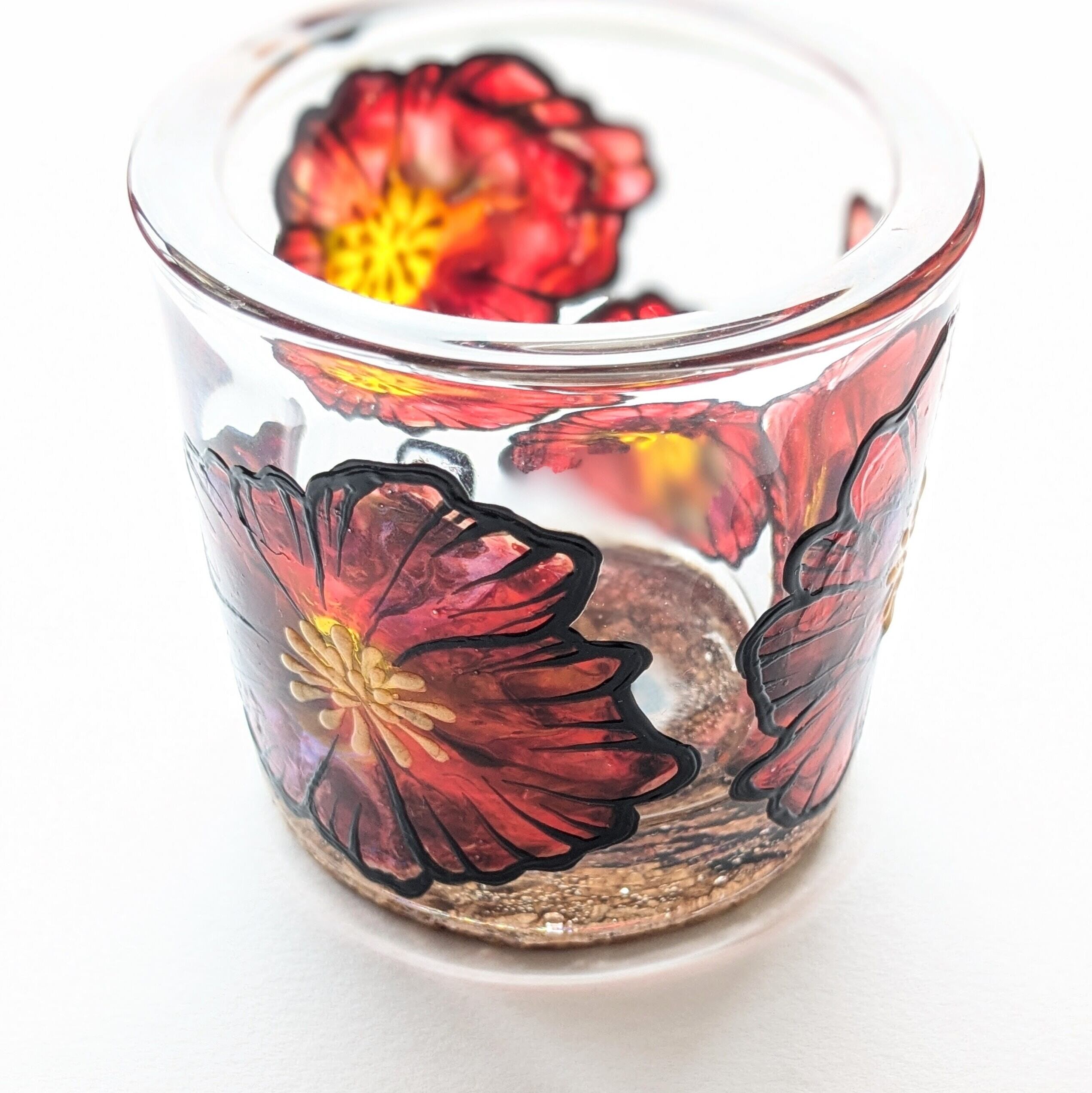 この水中花キャンドルホルダーは、美しいマーブル模様の花が施され、キャンドルを灯すことで幻想的な光を演出します。