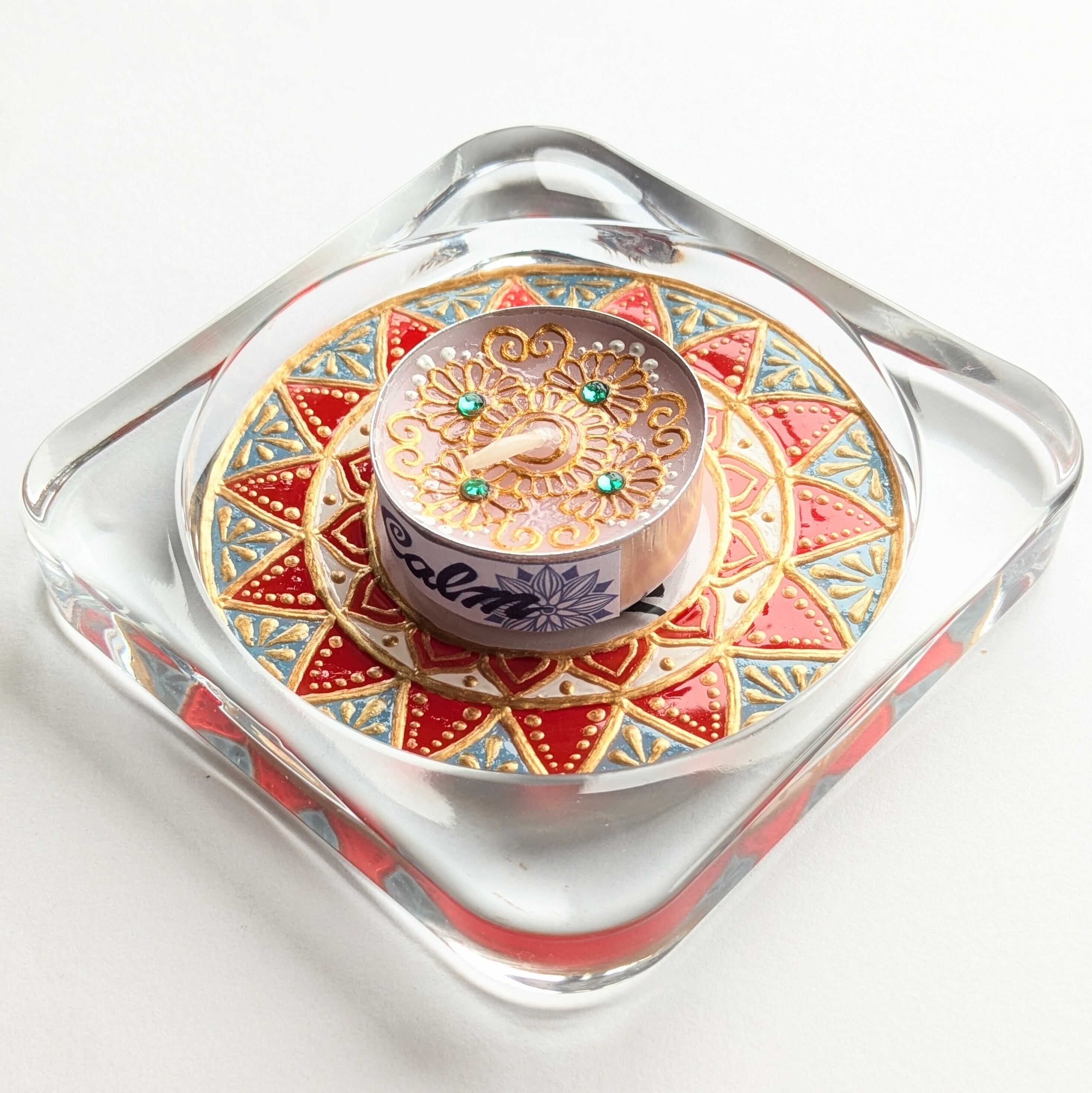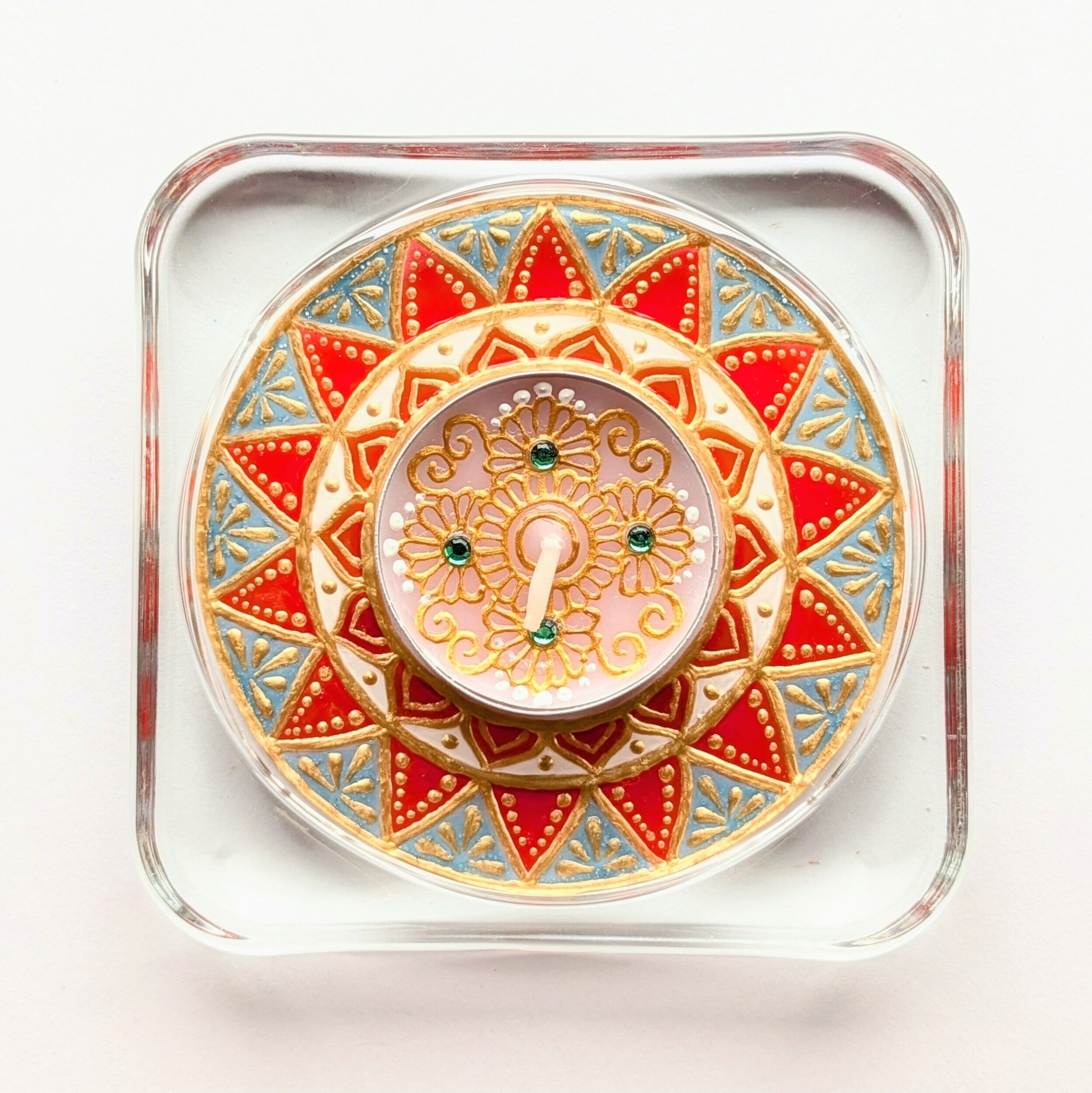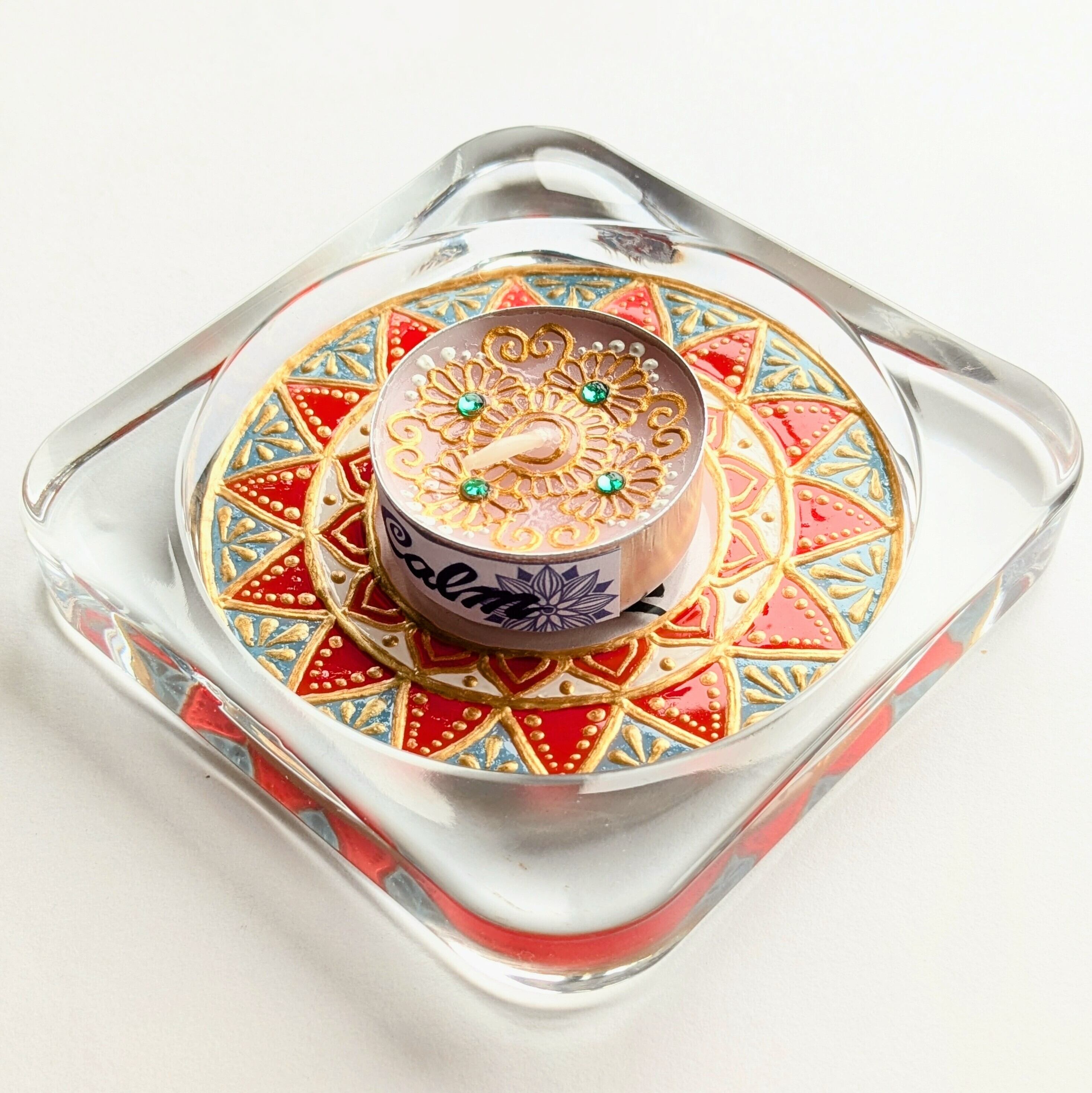 このヘナアートキャンドルホルダーは、繊細で華やかなヘナアートが施されています。